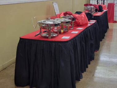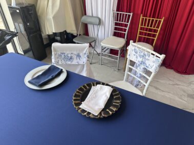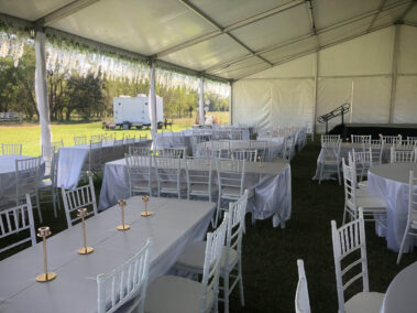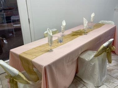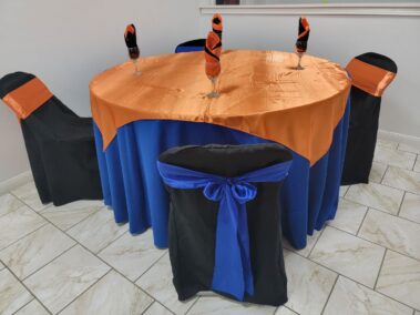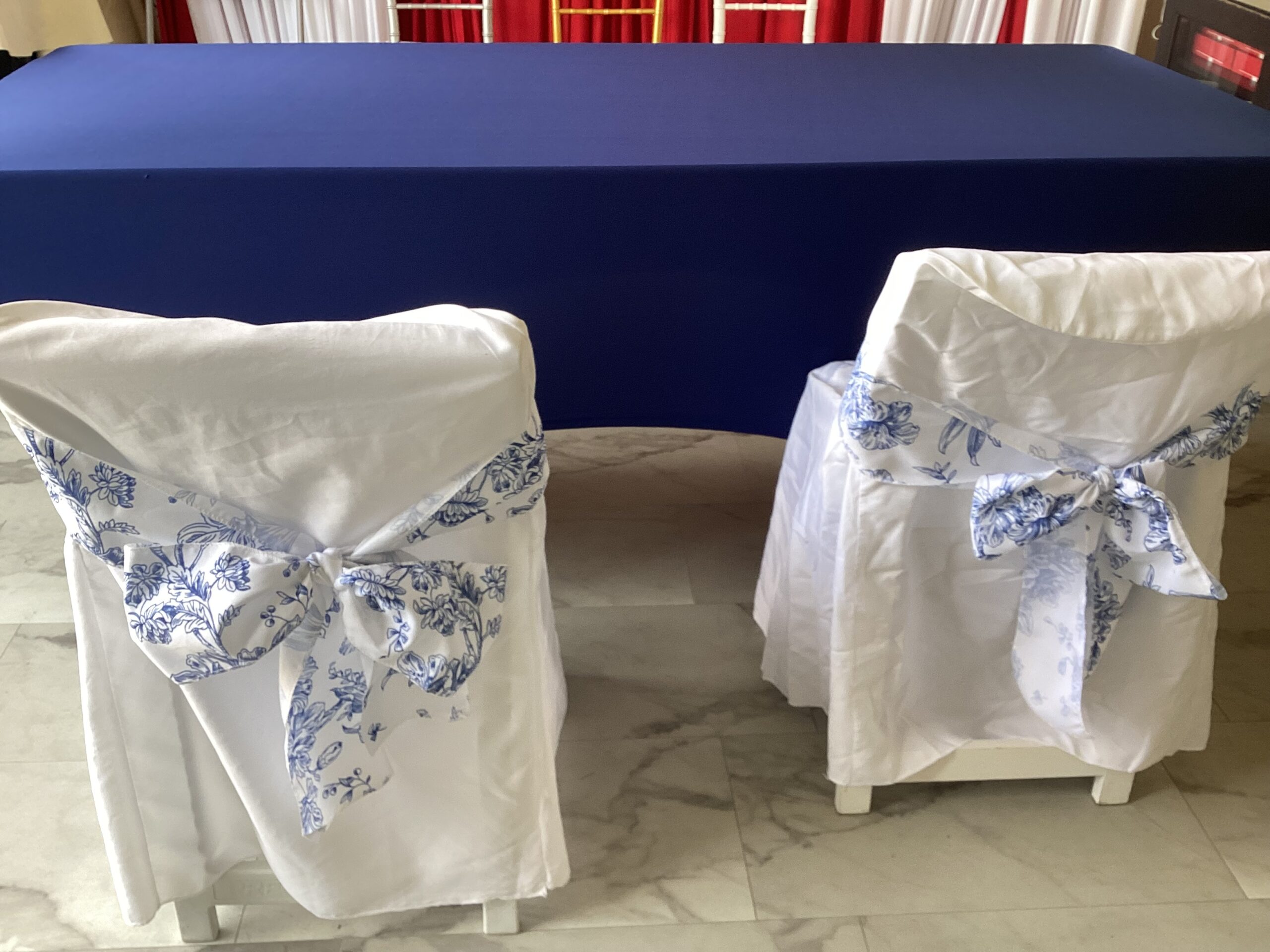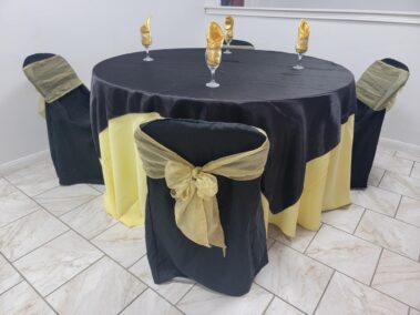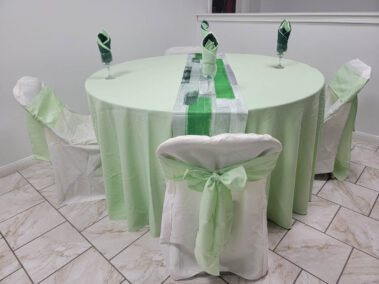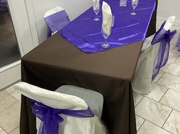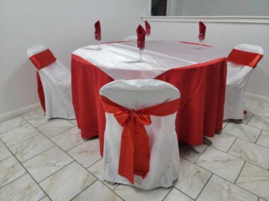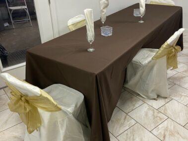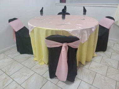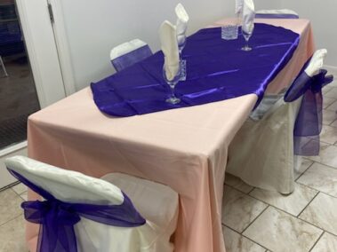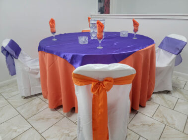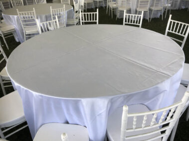 All wedding and event parties begins with tablecloths. Without tablecloths, table settings will not be complete and leaving the room extremely empty. We do offer polyester napkins to match with the tablecloths to complete the event. We carry many types of tablecloths including polyester, satin, pintuck, pinchwheel, flocking taffeta and crush taffeta. Our materials are high quality and could be reuse for many events to come. Complimenting the tablecloths, we do offer sashes and chair covers to make the party or event more elegant. H&R Tents and events should be your one stop shop for all your linens. There are no minimum requirement for our products. You may rent a single piece or many more according to your needs.